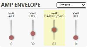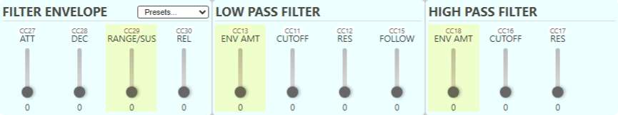 Like the Amp Envelope the Filter envelope uses the RANGE control to set the input gain to the envelope follower. Additionally both filters have their own ENVELOPE AMOUNT control.
