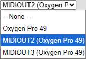 Some MIDI controllers have non-intuitive names for their outputs. For example, the Oxygen Pro’s 5-pin MIDI output is MIDIOUT2. This is on page 110 of the Oxygen Pro manual and is listed incorrectly. It’s often easier just to try them all until you find the one that works.